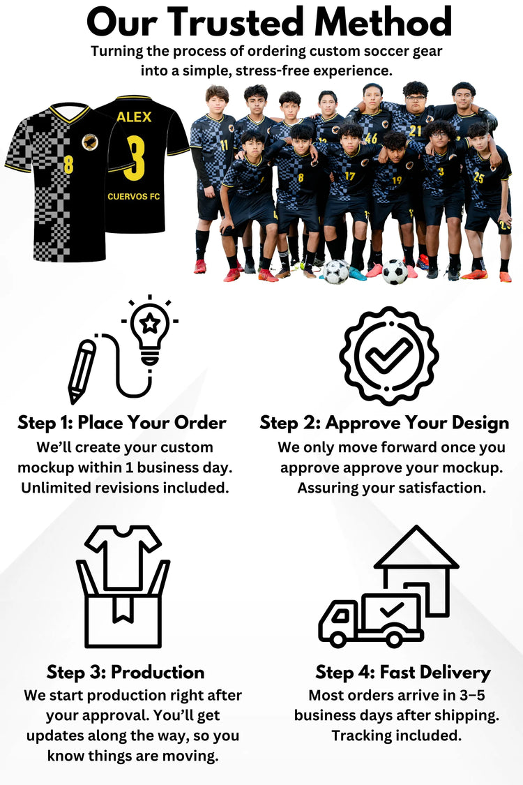 Enzo SS Youth Soccer Uniform Kit - BlackAvailable Size: Youth XSM-XL Customizable: Yes Material: 100% Polyester. Doesn't shrink or fade Features: Breathable, Quick Dry & Comfortable Washing Instructions: Machine Washable Fit Type: True to size. Please refer to the size guide. Includes: One jersey & One pair of shorts. (cannot be...